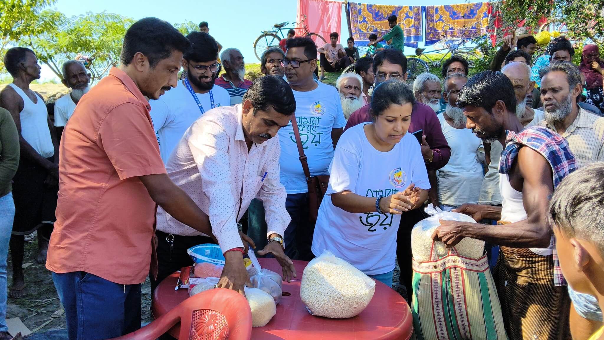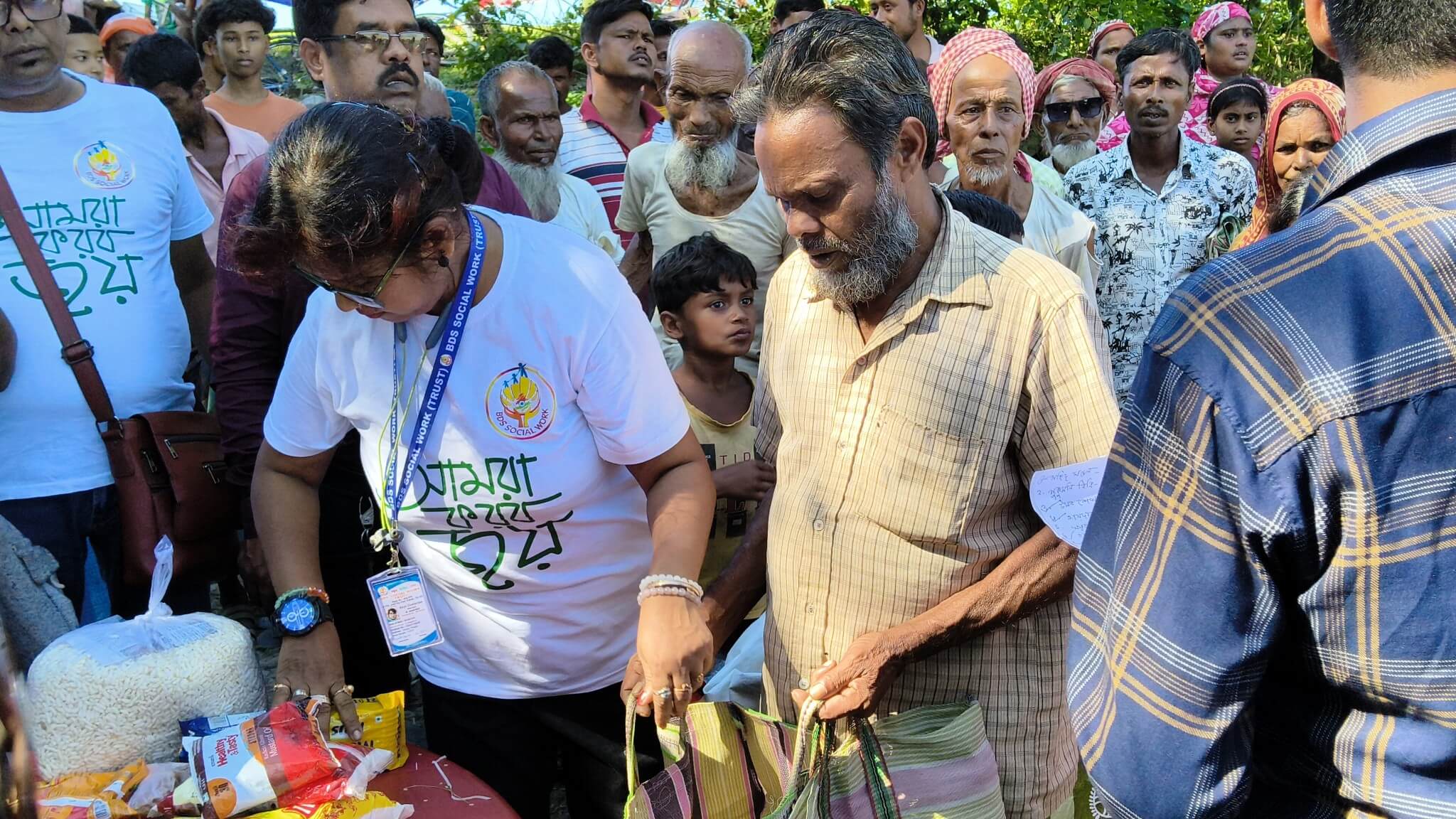 Each affected family received essential relief items, including rice, lentils, oil, potatoes, sattu, flattened rice, puffed rice, jaggery, biscuits, Amul milk, flour, and salt packets.